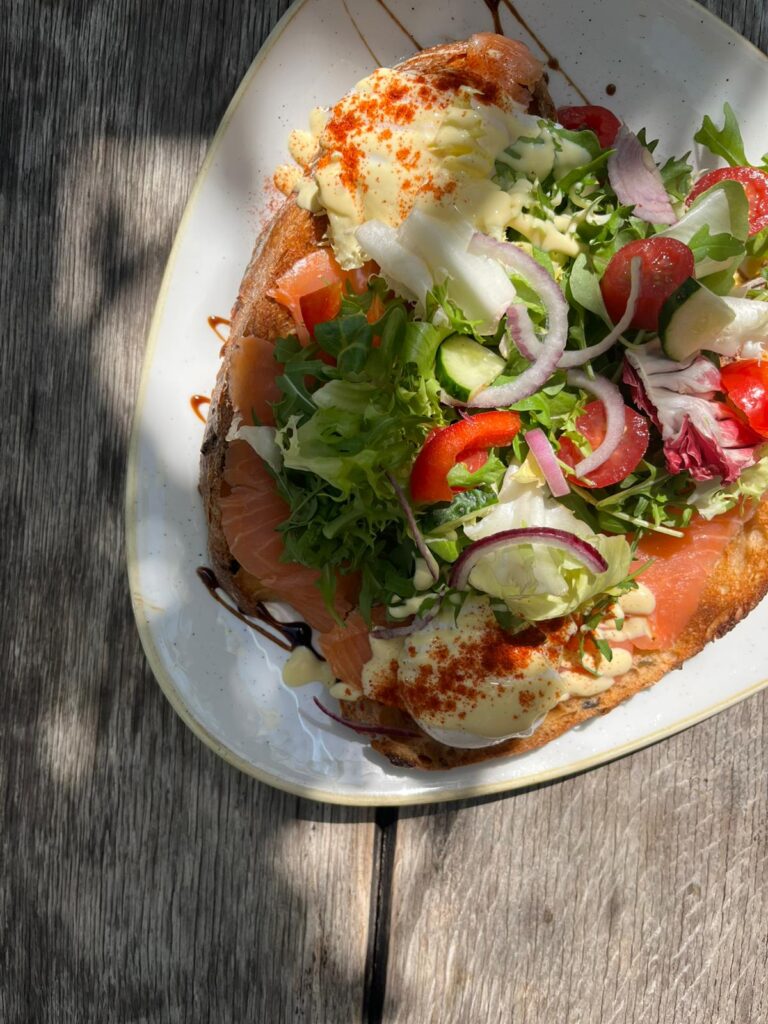 2 GRZANKI Z ŁOSOSIEM I JAJKAMI W KOSZULCE , SAŁATKA