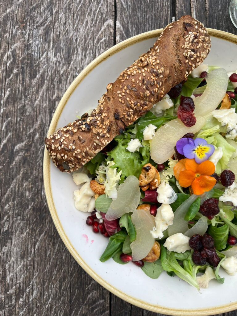 MIX SAŁAT, GRUSZKA, GORGONZOLA, GRANAT, ORZECHY NERKOWCA, PIECZYWO